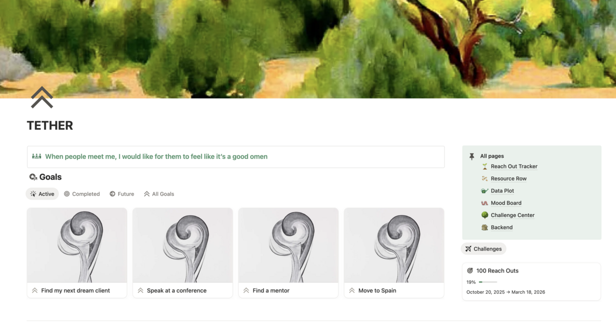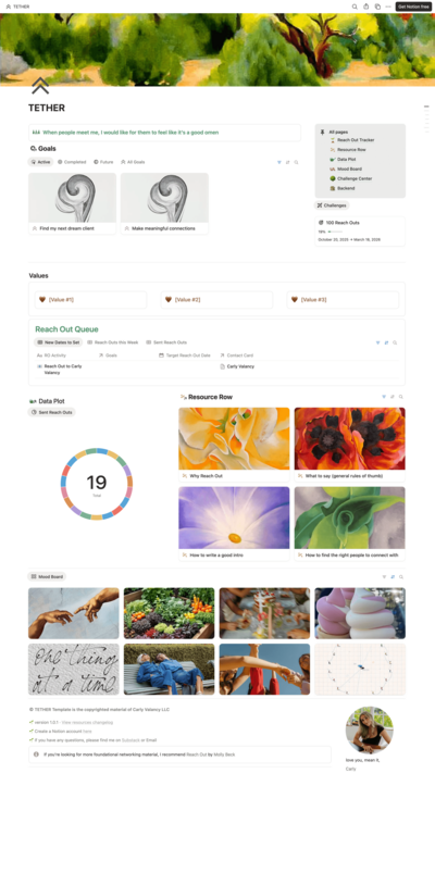 TETHER is a Notion-based networking operating system and a personal private CRM that helps you find, track, and nurture the relationships that move your life and career forward without the “gross” networking vibe.